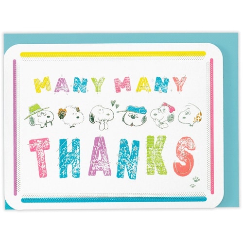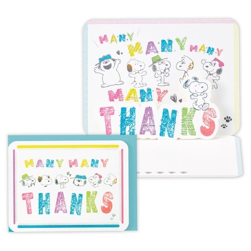 「MANY MANY THANKS」の文字と、スヌーピーときょうだいたちを大きくレイアウトしたポップなサンキューカード。たくさんのありがとうを伝えたいときにぴったりのデザインです。 |