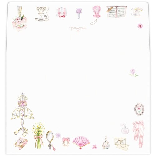 ときめきを運ぶ愛らしい小物たちの封筒。バレエシューズやアンティークのティーカップ、香水瓶、ブーケなど、心ときめく小物たちを集めました。 |