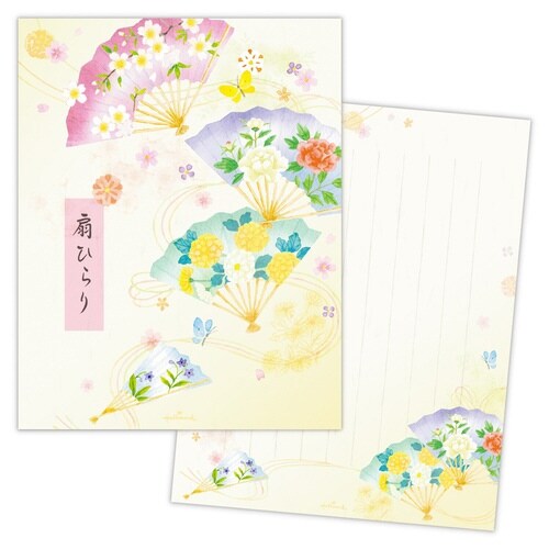 花咲く扇が舞う、華やぎの便箋。色とりどりの花が描かれた扇が、風に乗ってひらりと舞う優雅な情景を表現しました。 |