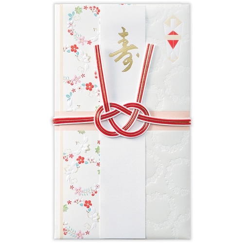 ご縁を結ぶ赤と白の円模様 鶴や梅、松など幸せを象徴するモチーフが円になっている結婚お祝い用の祝儀袋です。 |