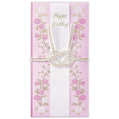 シンメトリーのお花のアートに繊細な金箔加工を施した結婚お祝い用の祝儀袋です。やや紫がかったピンクの地色にエレガントなバラがアクセント。小さな鞄に入れやすいスリムサイズです。 |