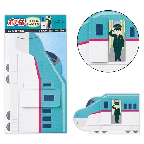 乗り物好きに◎E5系はやぶさのポチ袋 お子さまに人気の新幹線がキュートなポチ袋になって登場! 扉の部分を開くと乗り物にまつわる職業の人が登場する仕掛け付きです。 |