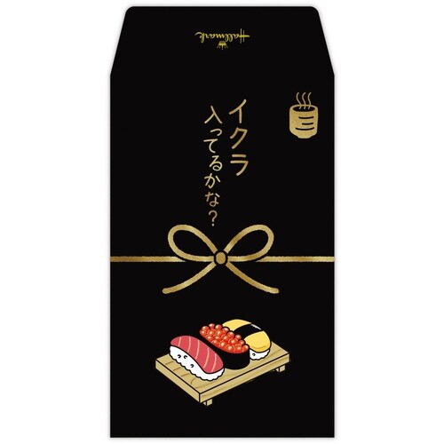 心づけはイクラ入ってる?ちょっとしたお礼や心づけなど、お金を渡すシーンに便利なポチ袋。お寿司の絵柄にちなんだダジャレをさりげなく盛り込んだ、クスッと笑えるデザインです。 |