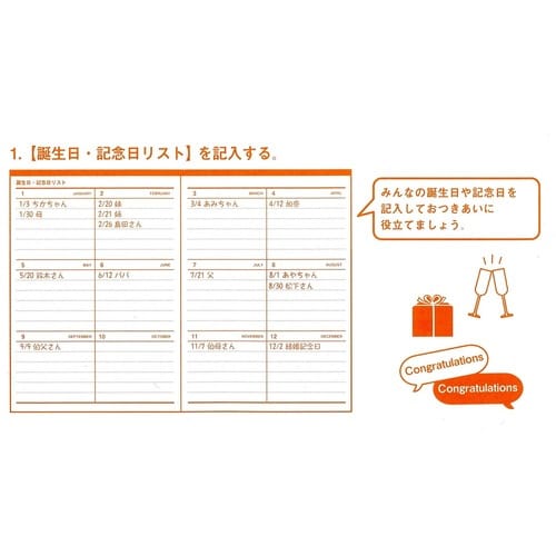親戚・ご近所・ママ友との贈答をまとめて記録できます。誕生日・記念日リスト、贈答のエチケット、人生の記念日一覧、住所録が付録としてついています。 |