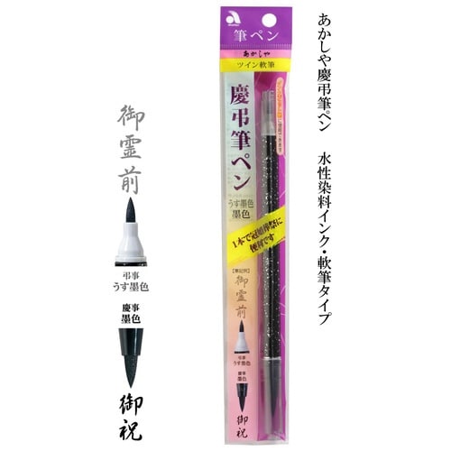 1本2役の慶弔筆ペン!慶事用の墨色と弔事用のうす墨色を1本に。冠婚葬祭に便利な筆ペンです。墨色、うす墨どちらも、サインペン感覚で美しい筆文字が書けます。 |