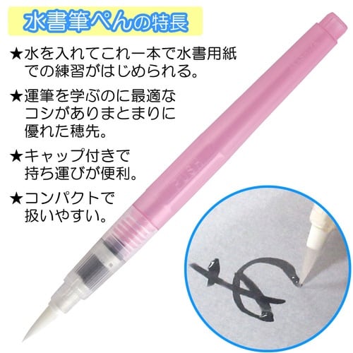 筆と水入れが一体となった便利な水筆ぺんです。水書用紙に、墨を使わず水で手軽に練習ができます。丈夫で扱いやすい特殊繊維を使用し、コシがありまとまりに優れています。 |