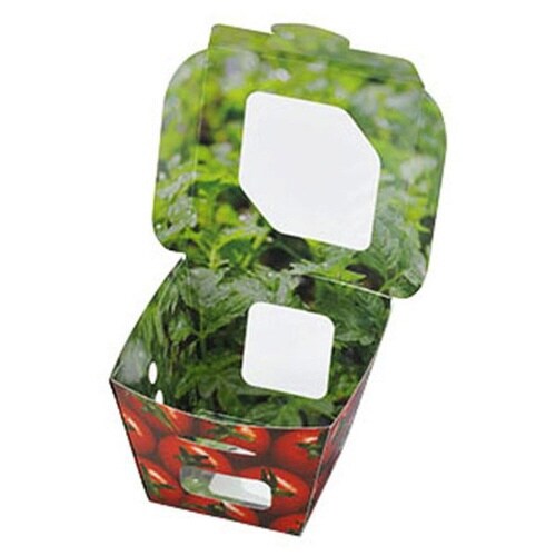 紙素材の青果物パック。鮮度確認用の窓開き(透明フィルム貼り)や、通気性を考慮した穴開き加工有り。FSC認証紙を使用した環境にやさしい紙容器。トマト柄が注文を集めます。 |