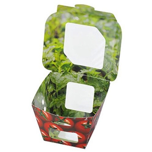 紙素材の青果物パック。鮮度確認用の窓開き(透明フィルム貼り)や、通気性を考慮した穴開き加工有り。FSC認証紙を使用した環境にやさしい紙容器。トマト柄が注文を集めます。 |