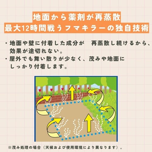 お庭やベランダでの作業やレジャーの前に、茂みや地面にプッシュするだけで、蚊のいない快適空間をつくります。処理面積あたりのオイル量を65%カット(従来品エアゾール比較)。ベタつきにくいクリーン処方。 |