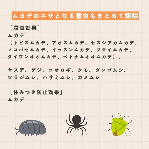 空間にスプレーするだけで薬剤がすばやく広がり、家具の裏やすき間などに隠れたムカデを退治します。処理後の後片付けや掃除も不要です。火災報知器に反応しない。ムカデのエサとなる害虫もまとめて駆除! |