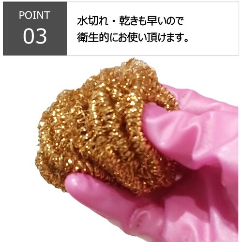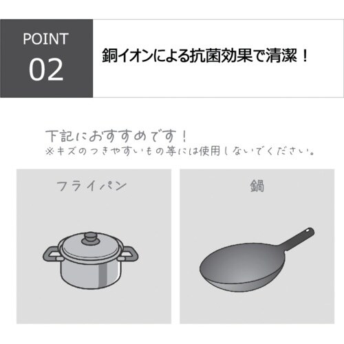 ガンコな油汚れ・こげつき・サビ取り用の弾力性のある銅合金です。銅イオンの抗菌効果で衛生的です。水切れ・乾燥も早く衛生的です。 |