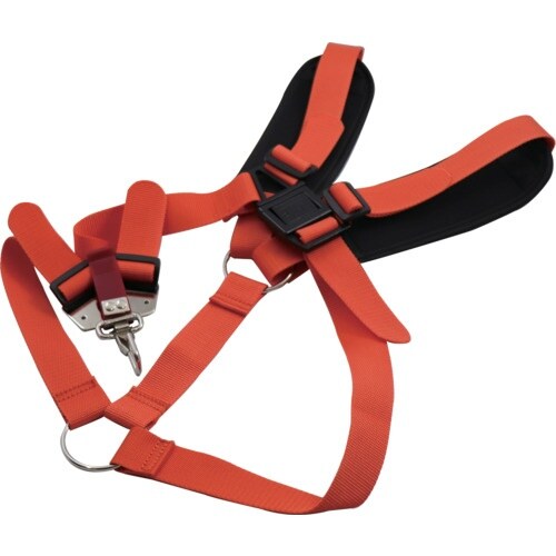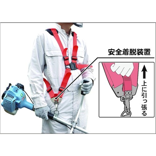 パッド部分が振動を吸収し、約60%低減(当社比)します。刈払機がワンタッチで外せる安全装置付きです。両肩で支えるので負担軽減できます。 |