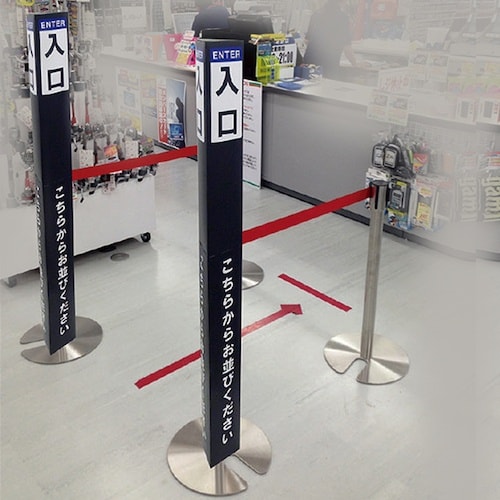 レジ前や誘導、整列、案内の待機列を誘導する表示サインです。列の入口/出口表示の視認性を高めます。リバーシブル(両面印刷)で入口・出口の表示が選べます。 |