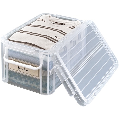 積み重ねできる丈夫な収納ボックスです。A4用紙がすっぽり入るサイズ感です。工具収納から押し入れ収納まで、様々なシーンで使えます。フタを固定するストッパー付きです。中身が分かりやすいクリアタイプです。