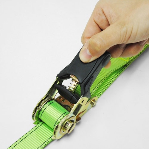 二輪車の積載や荷物の固定などに使用する、ラチェット式のタイダウンベルトです。締め付けが強いラチェット式なので、しっかりと対象物を固定することができます。 |