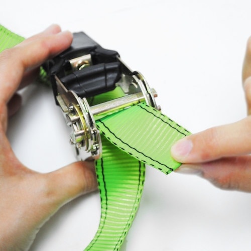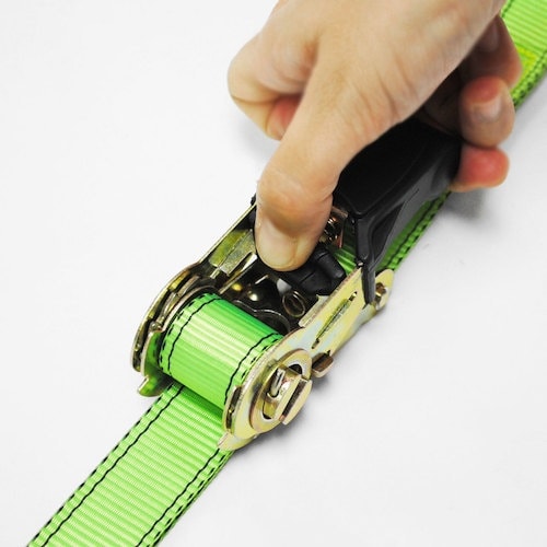 | 注意事項 | ※本製品は荷締めを目的としています。吊り上げ、牽引など本来の用途以外で使用しないでください。ベルトを結んだり、捩れた状態で使用しないでください。ベルトが毛羽立っていたり、縫い目にほつれがある場合は、使用しないでください。ベルトが角など鋭利な部分に接触した状態で使用すると、切れる危険性があります。 |