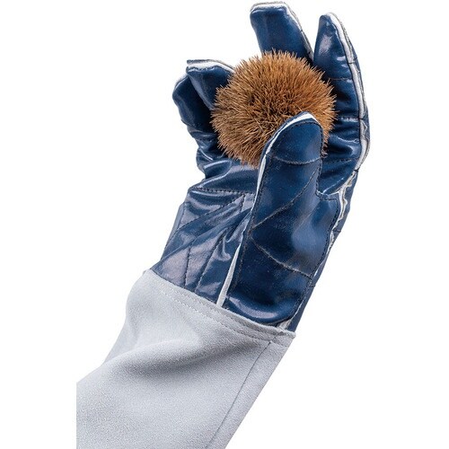 耐突刺特殊シートと豚本皮のW構造(手のひら部分)で手から肘付近までをガードできます。 |