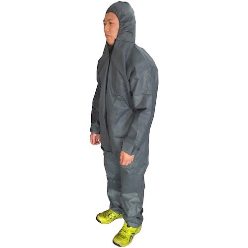 1層タイプの不織布つなぎ服です。汚れが目立ちにくいグレーです。白や青の不織布つなぎ服に比べ、「いかにも」感がありません。携帯等を取り出す際に便利なWジップ仕様です。 |