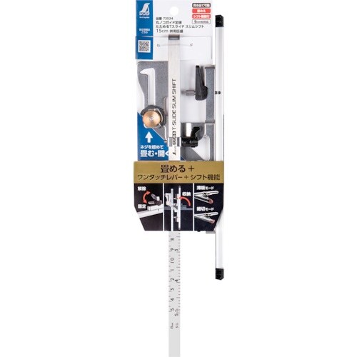 突き当てがたためるのでコンパクトに収納でき、持ち運びに便利です。ネジをスリットに沿って直角固定位置に固定するだけで90°になります。ワンタッチで薄板切りと細切りの切り替えができます。 |