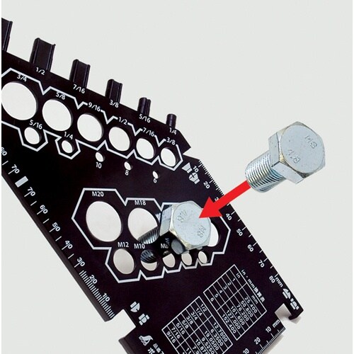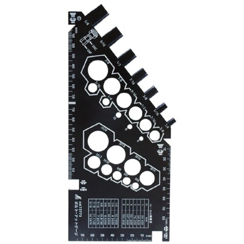 当てたり差したりするだけで、簡単にボルト・ナットのサイズを確認する事ができます。インチ・メートル換算表付です。ボルト・ナットの寸法測定。 |