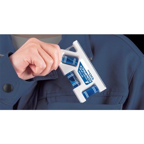 コンパクトな本体に水平・垂直・45°気泡管を装備しています。フック穴付きで落下防止コードが取り付けられます。測定面はV字溝付きでパイプ測定も可能です。水平、垂直・45°の確認に。 |