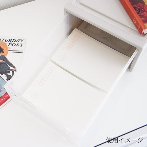 中身が一目瞭然な透明引き出しです。小物の整理整頓に便利な収納ボックスです。積み重ねてもたわみにくい丈夫な前枠付きです。はがきが2列で収納できるので、書類整理やビジネスシーンにもおすすめです。 |