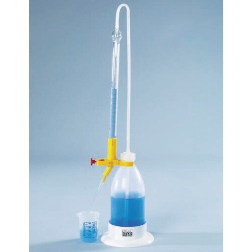 ポリ瓶を押すことでビュレット内に液を移動できます。満水時はストッパーが働き液こぼれを防止します。少しずつ液を定量分注したときに。中和実験などに。