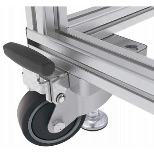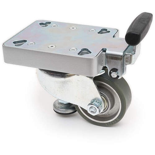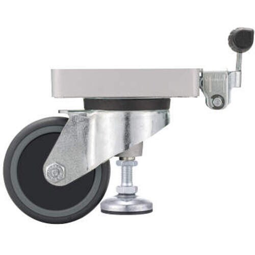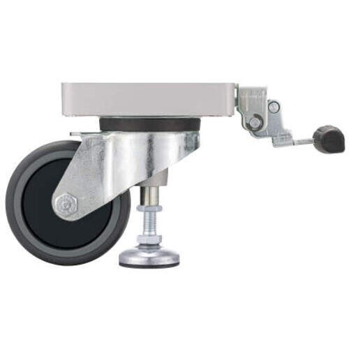 アジャスターの機能を備えたキャスターです。レバーのワンタッチ操作にてアジャスターの設置と解除が可能です。レバーが常に筐体の外側に位置しているので、固定時にキャスターを回す必要がありません。 |