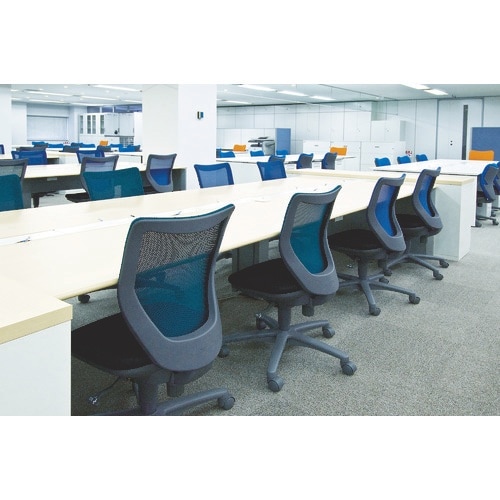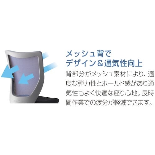 背部は通気性を追及したメッシュ素材、座部は長時間使用しても疲れにくいモールドウレタンを使用しています。背ロッキング機能付きで、ロッキングの硬さも座面後部のグリップで調整が可能です。 |