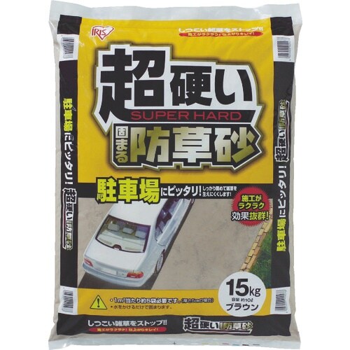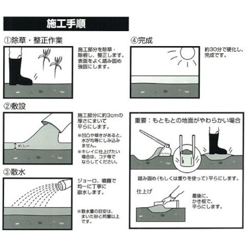 水をかけてから約3日ー1週間で固まる防草砂です。水はけがよい為、水たまりもできにくくなっています。夏場は保水による打ち水効果での冷感も期待できます。非常に硬い為、駐車場での使用に最適です。防草に。 |