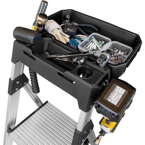 背面収納できる大きいトレーを上わくに取付可能なため、作業効率がアップします!上わくに電動工具なども挿せられ、便利です。上から2段目も幅広い天板仕様のため、安全に作業が可能です。倉庫や現場での作業に。
