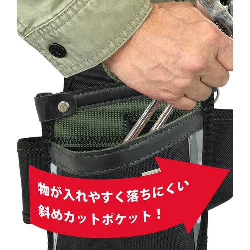 季節をモチーフにしたカラーバリエーションがポップなシリーズです。斜めカット採用の中身が取り出しやすく、落ちにくい腰袋です。迷彩柄がポイントになったクールなデザインです。工具全般の収納に。