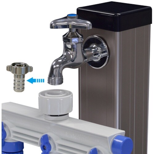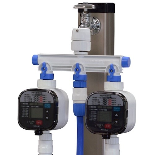 蛇口・ホースの接続部は、G1/2管用平行ネジ接続になっています。切替コックで通水・止水が可能です。かんたん水やりタイマーを2個取り付けできます。 |