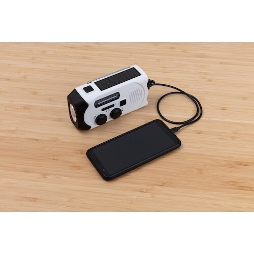 3種類の充電方法(USB、ソーラー充電、手回し充電)で災害時に役立つラジオライトです。1分間の手回し充電で約5ー7分ラジオが聴けます(中音量で使用した場合)。災害時のライト、情報収集に。 |