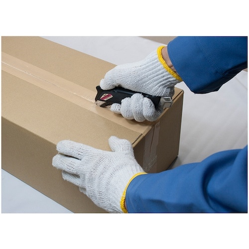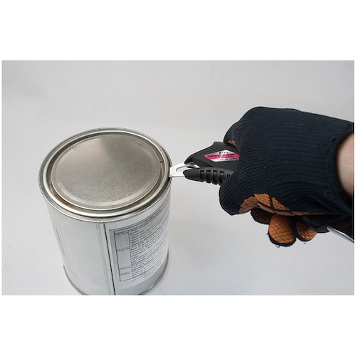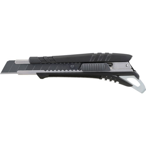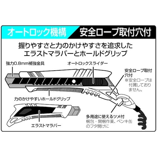 オートロックです。握り易さを追求したカッターです。エラストマラバーとホールドグリップで握り手をしっかり固定します。梱包・開梱・ペンキ缶のフタ空け等多用途に使えるツメ付きです。 |