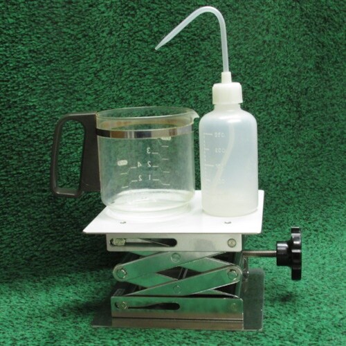 重量物の高さ移動に使用します。ノブを回転させれば、スムーズに平行上下移動ができます。実験機材の高さ調節。