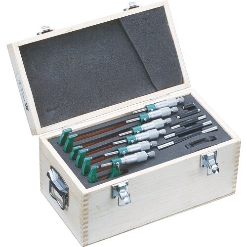 フレームは塗装仕上げです。保管に便利な専用木箱付入りです。測定面は超硬チップ付きです。測定面は超硬チップ付きです。定圧装置付です。フレームは塗装仕上です。基準棒5本付です。外側寸法の測定に。 |