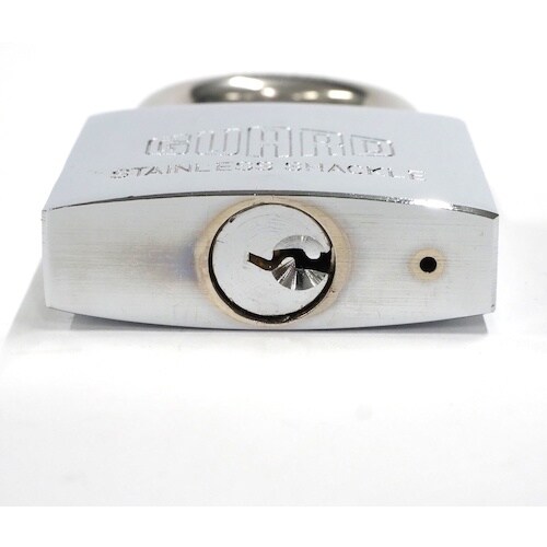 錆に強いステンレス製シャックルです。本体、シリンダープラグの外観はクロームメッキを施し、内部部品はステンレス製スプリング、ニッケルメッキ付ピン等を採して防錆効果を向上させています。