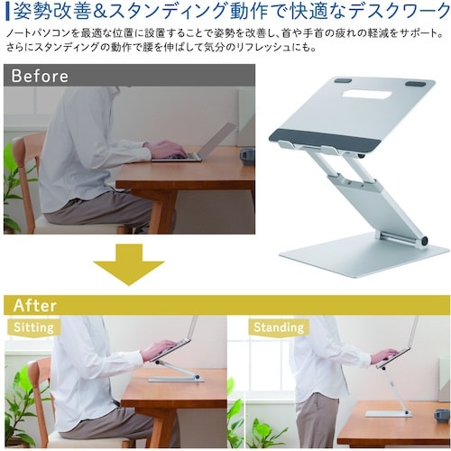 | 注意事項 | ※スタンディング使用の際は、ノートパソコンの落下や過度に荷重をかけすぎないように十分ご注意の上、ご使用ください。角度調整機能は、広げすぎると安定性が悪くなり転倒の危険があります。 |