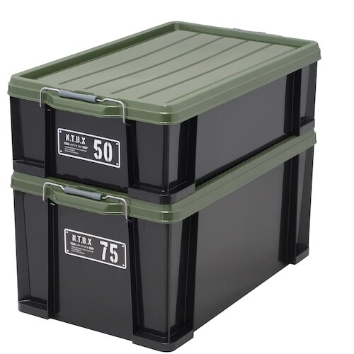 スタッキング(積み重ね)でき便利です。(当社品番#50,#75)長さを測れるフタに60cmまでの便利な目盛り付です。工具類やアウトドア収納に便利なバックル蓋付きコンテナです。 |