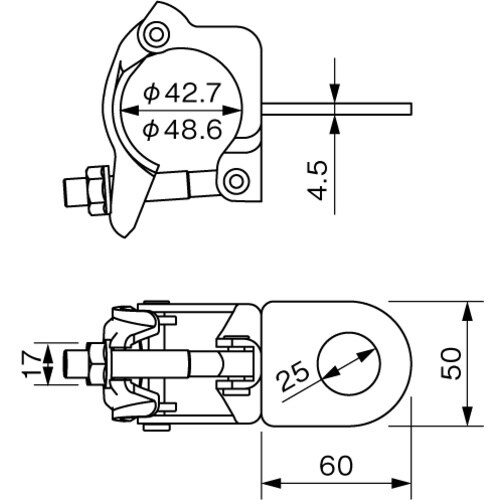 φ42.7/48.6の単管、枠組や一側足場に取り付けて、親綱、墜落制止用器具のアンカーやライフブロック、チェーンブロック、滑車などの吊下げに使用できます。 |