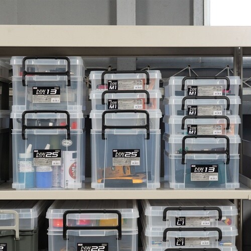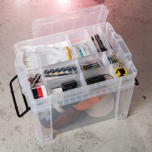 本体とフタはバックルで固定でき、持ち運びの際に中身が飛び出したりしません。散らかりやすい小物などを、仕切板でスッキリ収納できます。浅型・深型2段タイプで、小物、大物をまとめて収納できます。