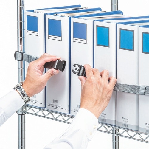 オープン棚に収められた書類、ケースなどの収納物の落下を防止するベルトです。オープン棚の支柱に巻き付けるだけの簡単設置でパイプ型支柱にも対応します。