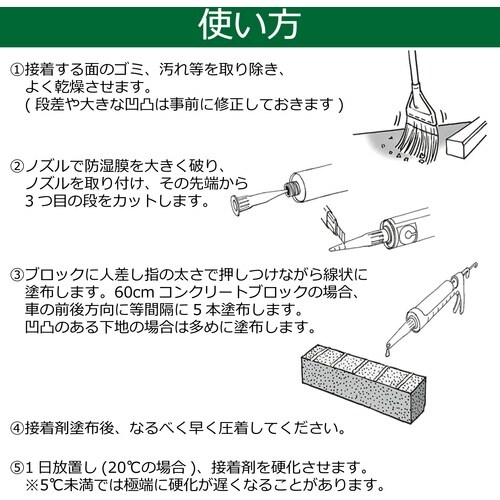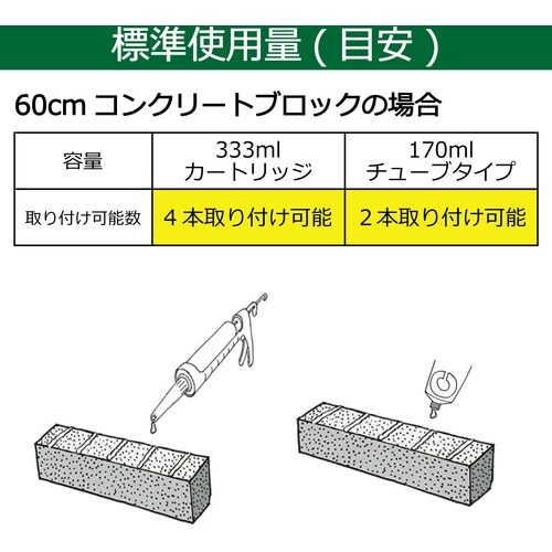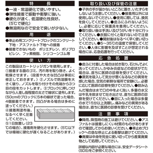耐衝撃、耐水性に優れます。一液タイプで使いやすいです。無溶剤型で臭いが少ないです。車止めブロックのコンクリート下地、アスファルト下地への接着に。 |