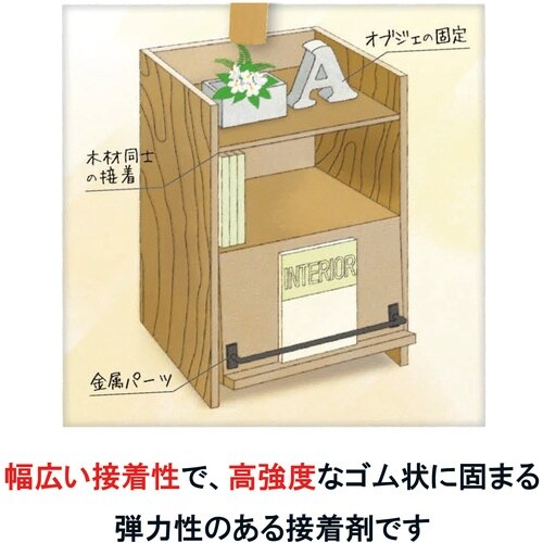 熱や水に強く屋外でも使用可能です。衝撃や振動に強い弾性接着剤です。使いやすい一液タイプです。日本接着剤工業会 JAIA F☆☆☆☆規格品、4VOC基準適合品です。
