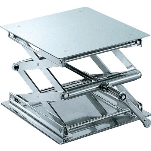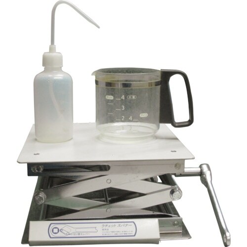 重量物の高さ移動に使用します。ラチェットを回転させれば、スムーズに平行上下移動ができます。実験機材の高さ調節。