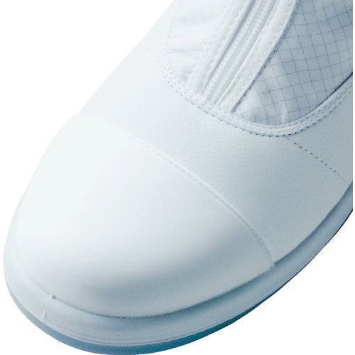 破損しやすいつま先をガードしたゴミが出にくいフルキャプ仕様です。つま先にワイド樹脂先芯を搭載したクリーンルームシューズです。特殊な設計と素材を採用した靴底で、チッピングによる発塵を防ぎます。 |