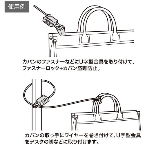 ワイヤーとダイヤル錠が一体型になっており、持ち運びに便利です。ワイヤーとダイヤル錠が一体になったセキュリティーワイヤーです。外出時や新幹線などでの移動時に、バッグの盗難を防ぐことが出来ます。 |