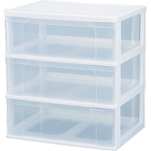 中身が見えるワイドチェストです。引き出しにはストッパーが付いており、落下を防ぎます。着脱簡単フレームなので引き出しの増減が可能です。前後方向への移動がスムーズにできるローラーが付いています。 |
