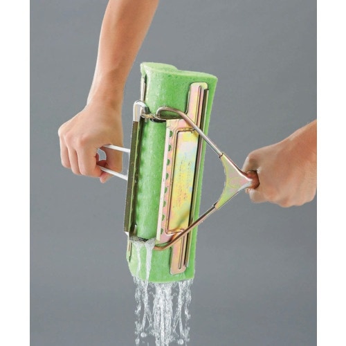 水絞りはレバー操作でワンタッチです。環境に配慮したウッド調スチールハンドル。手を濡らさずに絞れます。W300mmのワイドタイプスポンジ採用。多孔質のスポンジが汚れと水をしっかり吸水します。 |